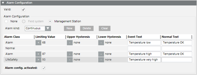 - Discrete alarm, for example, an alarm range of 68 through 86 or a listing, such as 70, 80, 90.