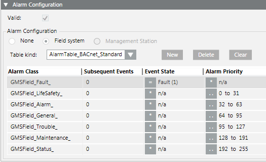 Field system alarms are generated at the level of the subsystem, panel or automation station. Alarm tables are used to map these field events to Desigo CC alarm classes.