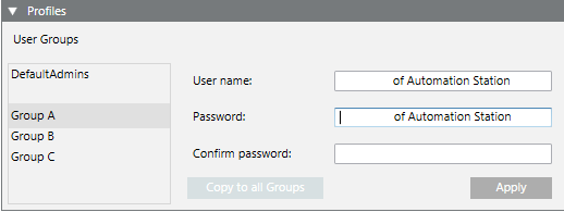 One password can be defined for each user group per Desigo automation station. The password must be entered when connecting to the Setup and Service Assistant if passwords differ on the network. In the event of multiple passwords, we recommend using the password that is used on most Desigo automation stations.