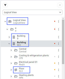 The Room Overview displays in Flex Client if the object is a Campus, Building, or Floor (blue frame in the following image). The objects are configured by default to Order so that attributes must be reassigned to them.