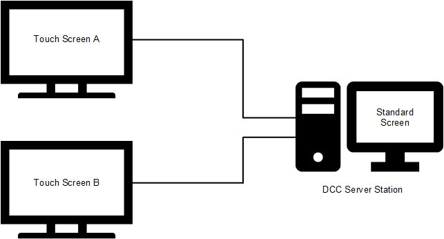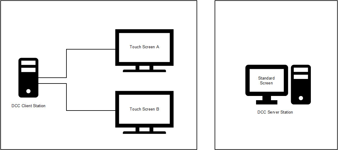 B) Configuration of server station linked to the main monitor and one client station linked to the two touch-screen monitors.