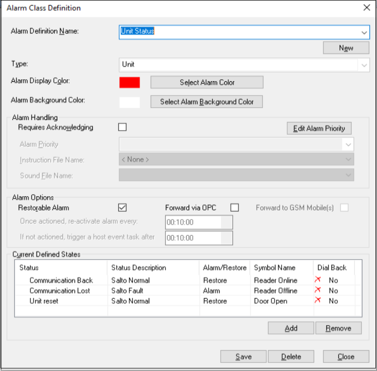 - Configure a Unit Status alarm class definition as follows: