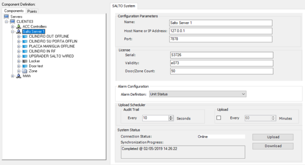 - Statuses and events are updated on a periodic basis, when SiPass uploads the data from SALTO. The frequency is configurable in SiPass. See the example below.