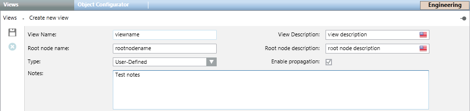 In Engineering mode, when you select the main Views root or any object under it, the Views tab displays. Here you can create new views or delete existing views. To a limited extent, you can also modify the settings of existing views.