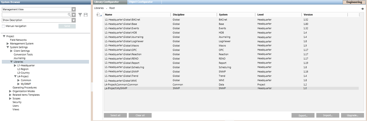 - When the import is complete, the SNMP library appears under its specific library level and folder in System Browser.
