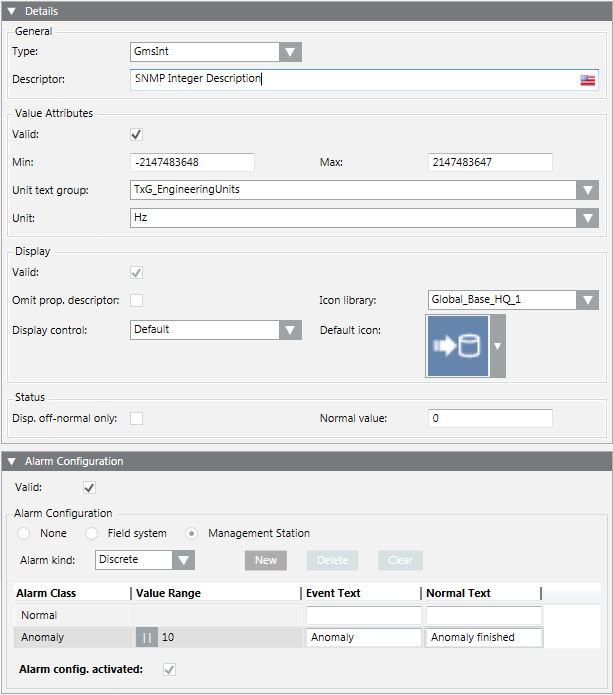 - Enable the Alarm Configuration and select the Management Station option. Then define the behavior of all the alarms belonging to this DPE (for example, when the SNMP point reaches value 10, the management station will trigger an Anomaly event).