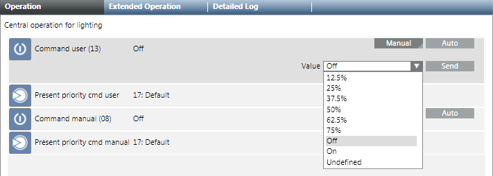 - Select Applications > Logics > Central Functions > [Network name], property User command (13) [Category] > [Central Operating Mode (CenOpMod)].