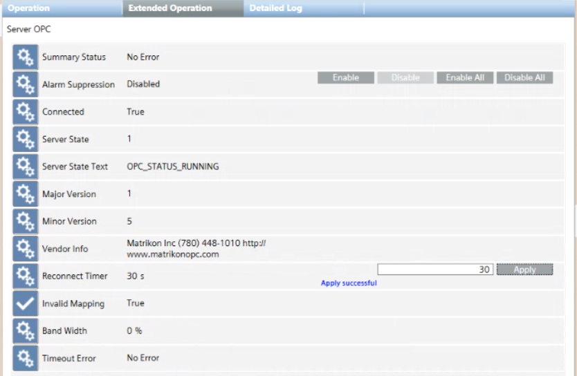 When you select a third-party OPC server, the Extended Operation tab displays its properties and commands.