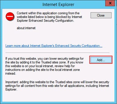 - In the Internet Explorer dialog box that displays, click Add.