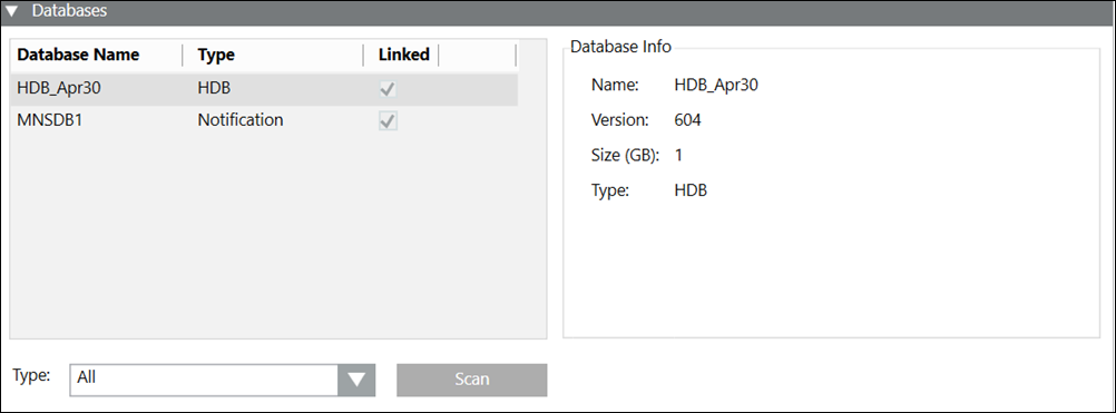 Scan | Detects the History Databases on this SQL Server instance according to the selected type in the Type drop down list. |