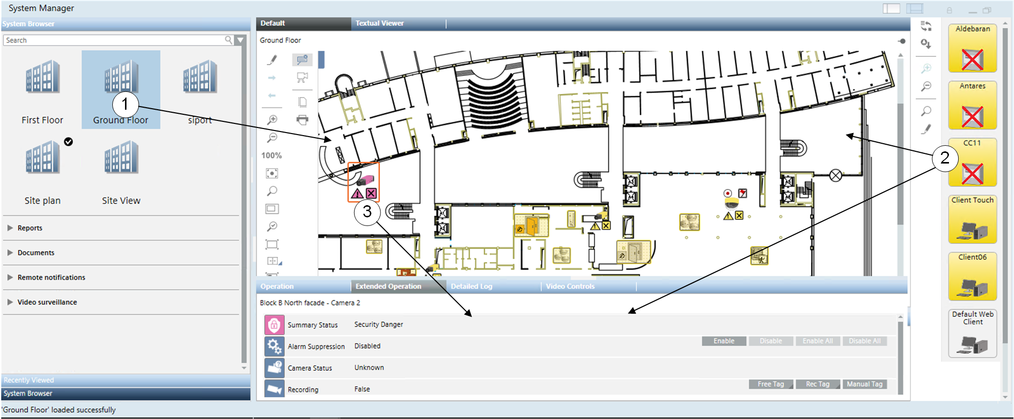 System Manager is a multi-pane window for navigating, monitoring, and controlling all the components and subsystems of your site. For example, you can inspect properties and states of objects, consult floor plan graphics, send commands, and so on. In the Lite DMS User Interface, two System Manager layouts are available, a primary and an advanced layout, and you can easily switch between the two.