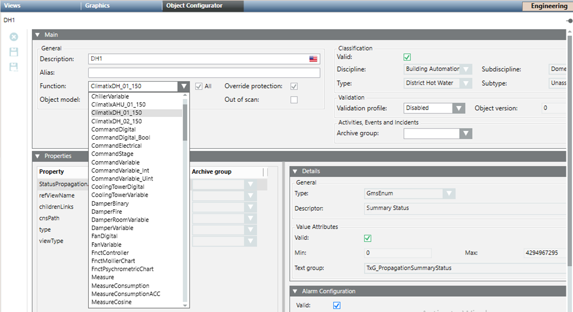 - Click the Object Configurator tab, and associate the function Climatix_AHU_01_150 or Climatix_DH_02_150 to any one of them. The function you decide to associate depends on the graphic template you want to use (see Climatix Heating System Library).