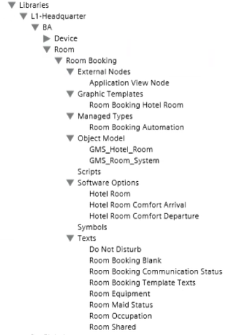 The Room Booking extension installs the Desigo CC library BA_Room_RoomBooking_Any_HQ_1, which is available at Project > System Settings > Libraries > L1-Headquarter > BA > Room.