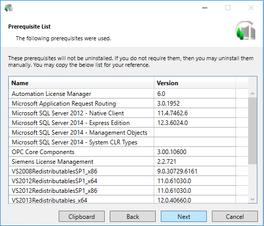 - Click Next. The Prerequisite List dialog box displays a list of software used by Desigo CC .