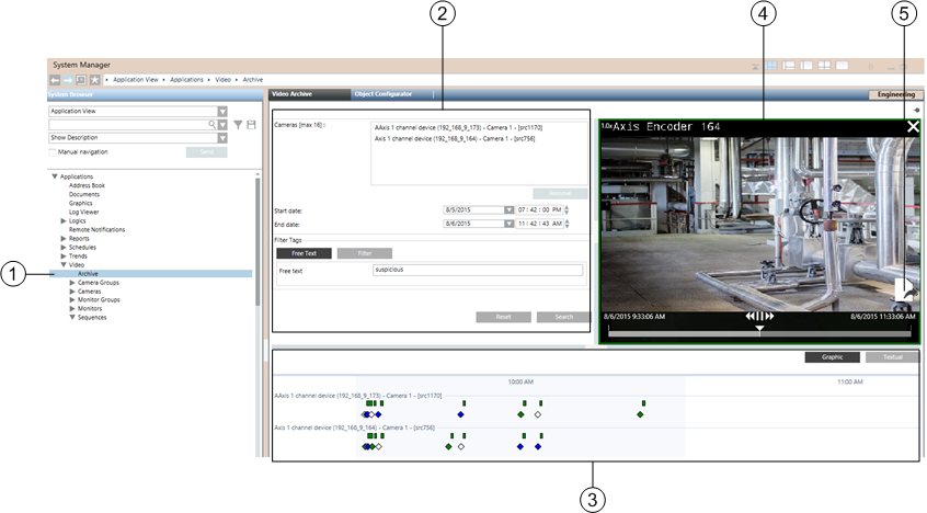 When you select Video >Archive in System Browser, you access the Video Archive tab, from which you can run queries to search for recordings. For step-by-step instructions see Finding Recordings in the Video Archive.