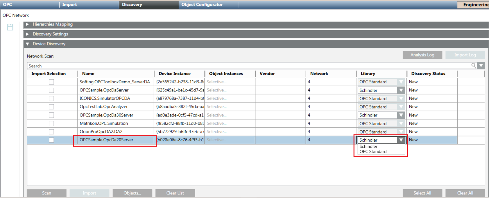 - As local OPC servers are discovered, they appear in the Network Scan section. In the Device Discovery expander, the Library column relevant to the server OPCSample.OpcDa20Server.1 contains the Schindler library.