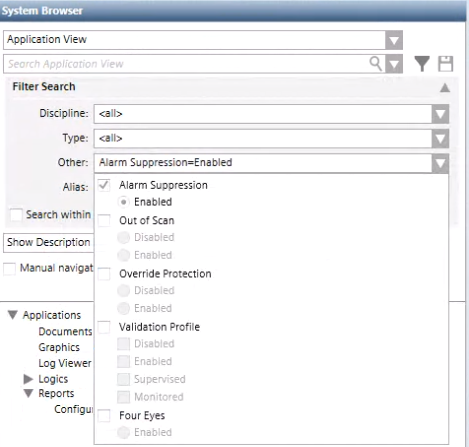 - In System Browser, select the system object for which you want to enable alarm suppression.