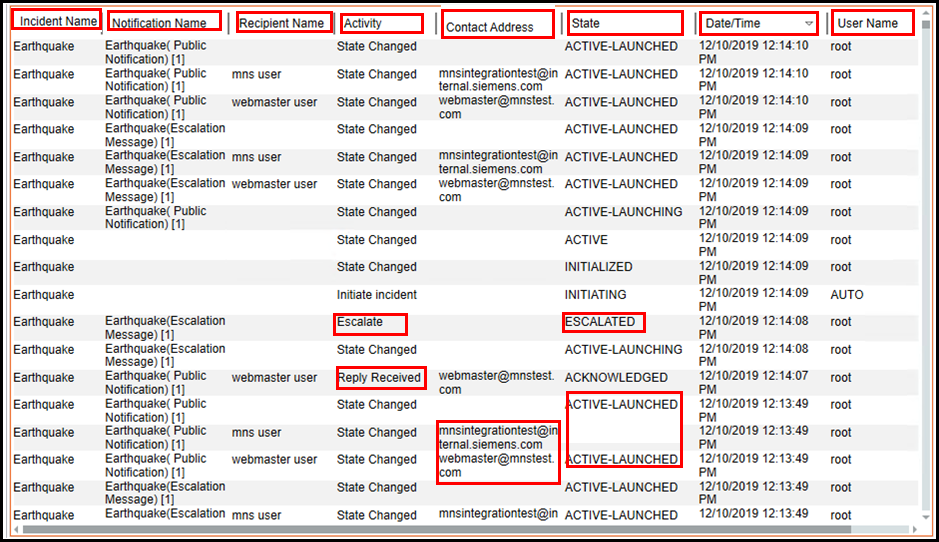 AcknowledgedandEscalated) - Date/Time: The date and time of the action performed as per the details mentioned in each row (for example, the reply from the recipient user was received on 2/11/2015 at 10:37:44 PM and the target message template (Earthquake(Escalation Message)) was escalated on 2/11/2015 at 10:37:44 PM.