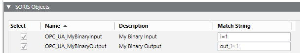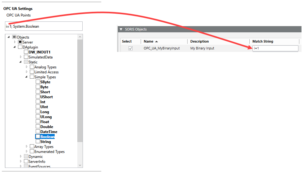 NOTE: When you export the data model, in the Match string field of the SORIS Objects expander, you must enter the exact data type identifier, with the following format: i=[identifier]. You can find this information in the SORIS OPC UA Configurator tool, when you select a variable object in the tree in the OPC UA Settings section. See the following example, where the Boolean data type has identifier i=1.