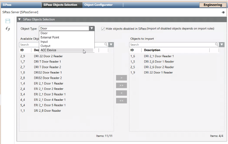 - The Objects to import list on the right shows the SiPass objects of that type included in the Desigo CC configuration. Any excluded objects are shown in the Available objects list on the left.