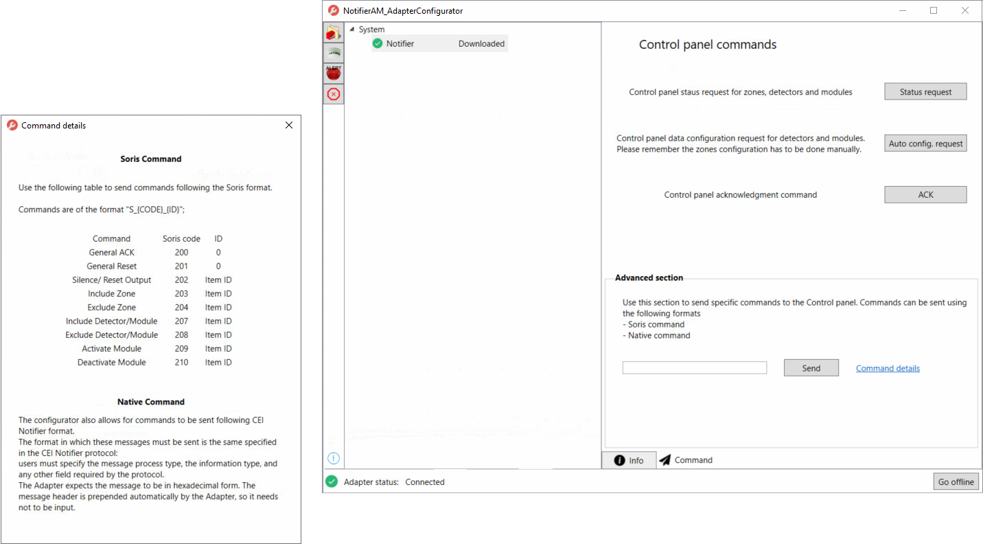 In the Advanced section area, do the following: a. Click Command details to view the list of commands in SORIS format and any information relevant to this diagnostic task. b. Enter the code that corresponds to the command you want to test using the following format: S_[SORIS code]_[last number of the Item key]. For example, to test the command Include Zone (SORIS code = 200) on zone with Item key = 1_10_1, enter the command code S_200_1. c. Click Send.