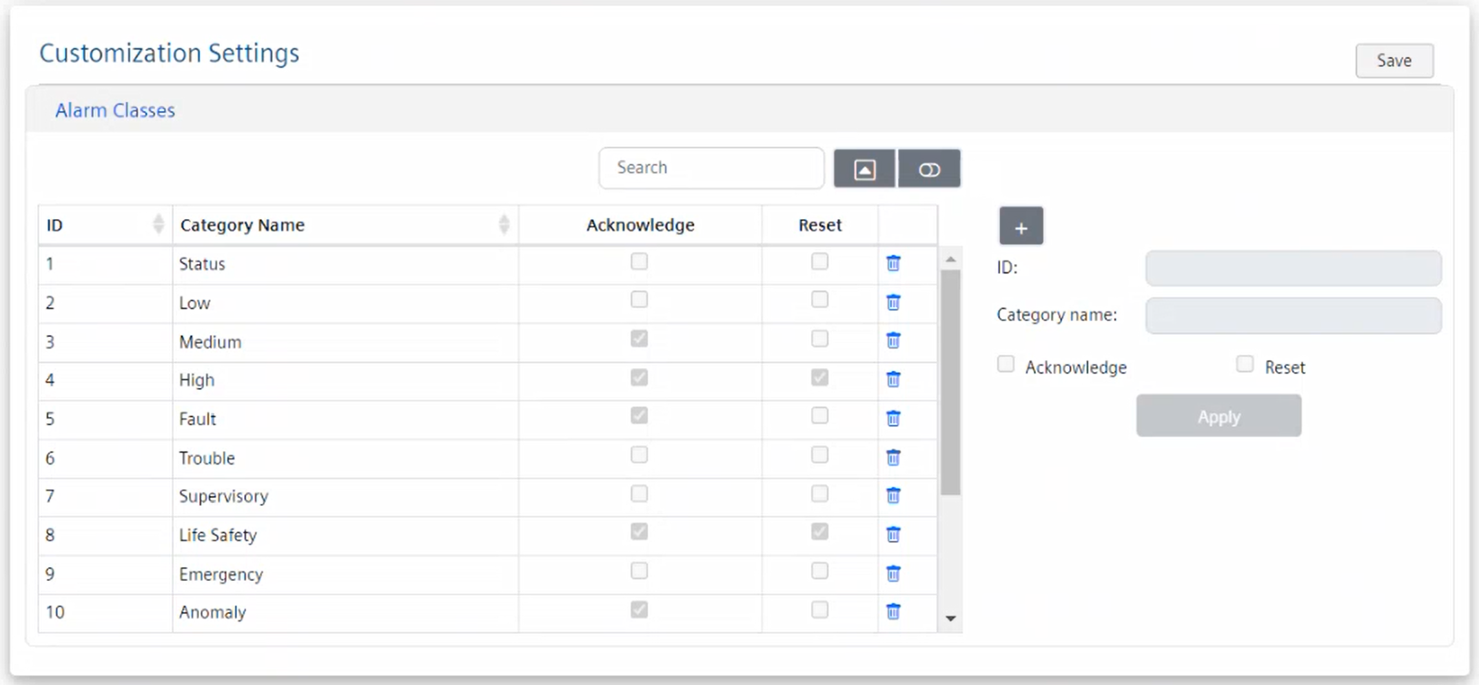NOTE: ID is a unique value that cannot be modified. Furthermore, the alarm class customization settings must match exactly the configuration of the customized alarm table in Desigo CC. - To remove an alarm class, do the following: