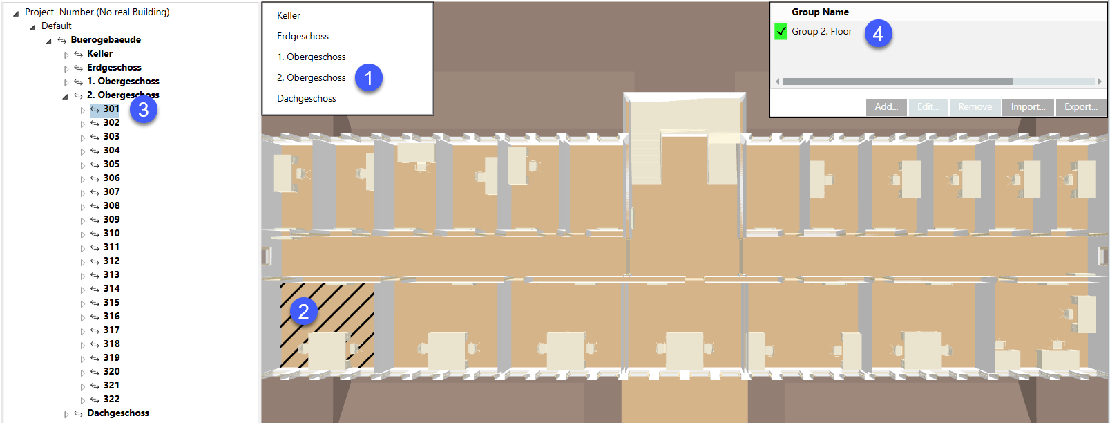 - Drag the room from the BIM room hierarchy (3) to the new group (4).