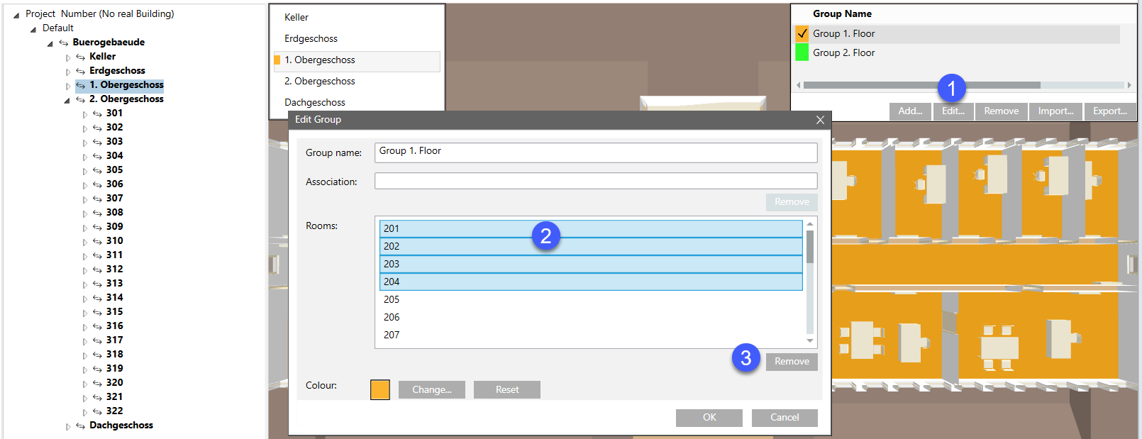 - Click Edit (1) and highlight the rooms (2) that do not belong to this group.