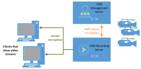 You can encrypt the video streams sent from the VMS to the client stations. You can also encrypt the bidirectional communication between VMS management server and VMS recording server(s), when these are on separate computers.