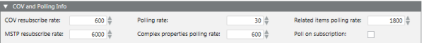 The COV and PollingInfo expander contains the default values for data reporting. Usually, default values are optimal. However, you can change the default values if the network traffic is high.