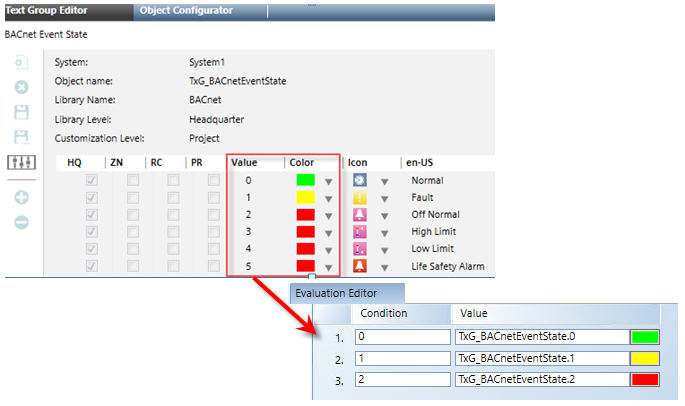 - In the Condition field, use the integers from the Text Group table associated with the property of the data point you are monitoring. For each condition, do the following: