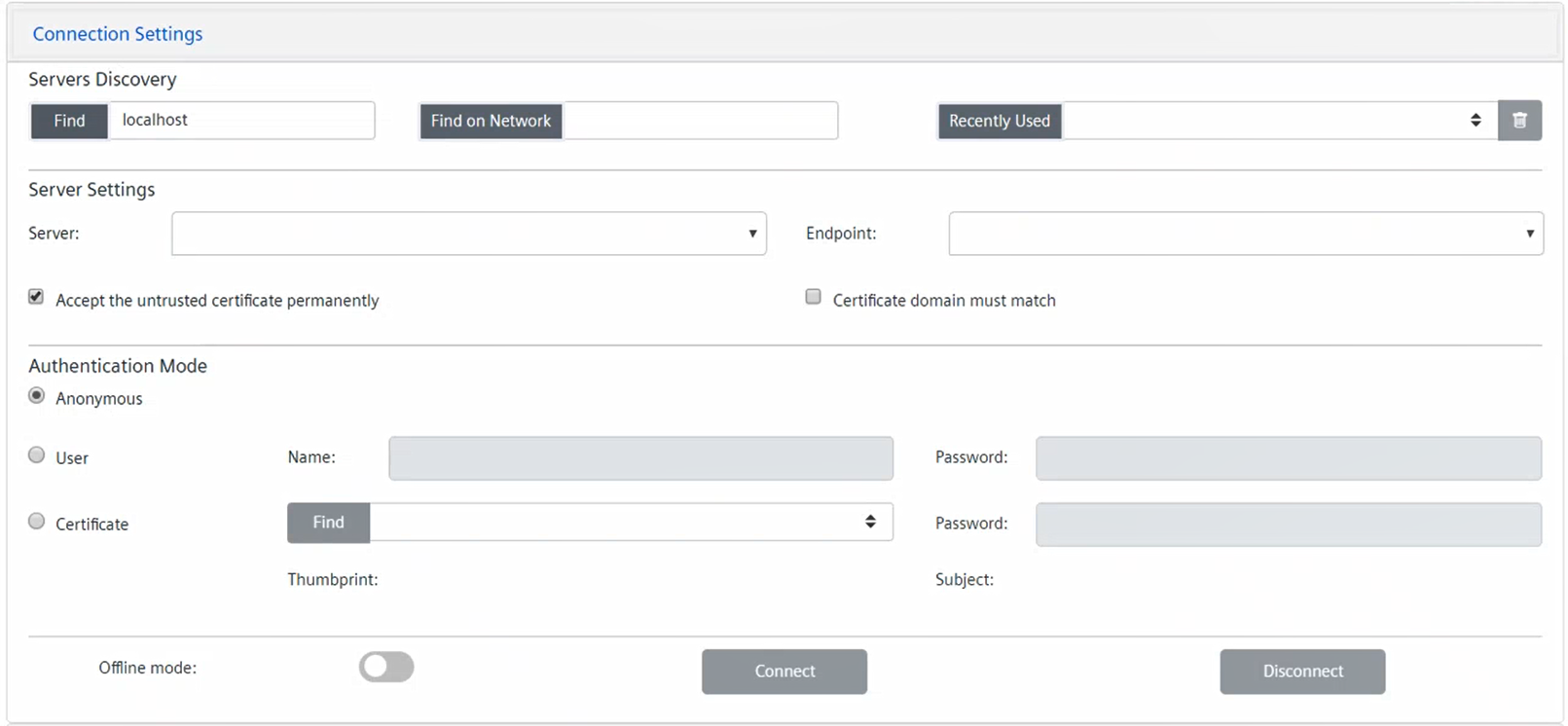 NOTE: By default, in the Hostname field, localhost is set. - To discover OPC UA third-party servers over the network on a specific station, in the field, enter the URL of the machine where the discovery service is running and then click Find on network.