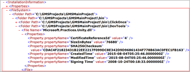 - Provides the checksum report for the files (having file types: .drv, .com, .dll, .exe, .ctc, .lst, .ctl) contained in the active project’s folder, the GMSMainProject folder, and the WinCC-OA. The data is reported under the respective folder in the File System section of the XML. If no value is fetched for a particular property the property itself is not displayed. For example, if value of signing time for a file is not available signing property is not displayed.