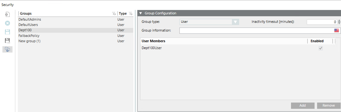 In the New Group dialog box, define the group of users to which the Desigo CC user belongs: a. Select the User radio button. b. In the Group name field, enter the account name. For example, Dept100. c. Click OK.