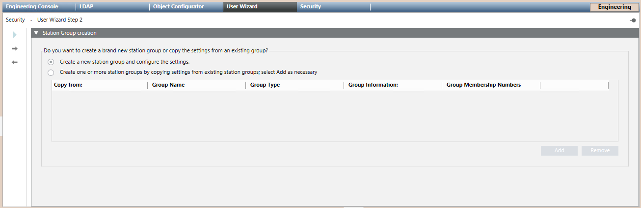 Create a New Station GroupYou are in the User Management Wizard step 2 – Station group creation.Select Create a new station group and configure settings. Click .