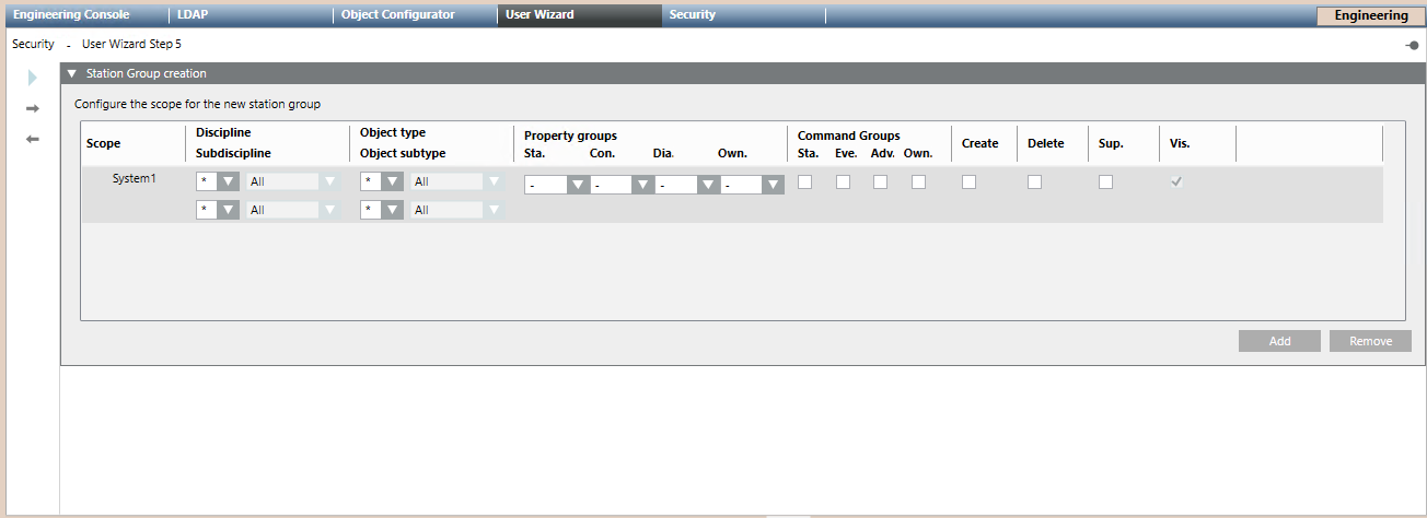 Under Configure the scope for the new station group, you can configure the scope for the new group. Define the scope rights as: