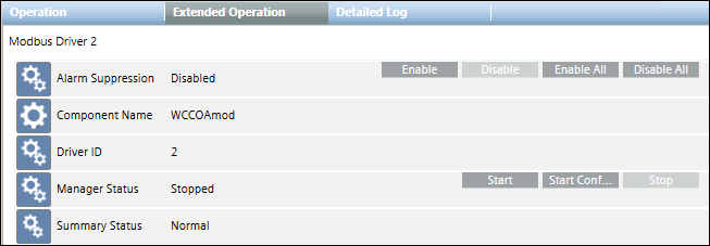 From the System Browser tree, when you select the Modbus Driver node (in Engineering/Operating mode), the Operation/Extended Operation tabs display the Start and Stop commands that you can use to start and stop the driver. The Stop command is only enabled when the driver is running; it is disabled if the driver is not running or an operation is in progress.