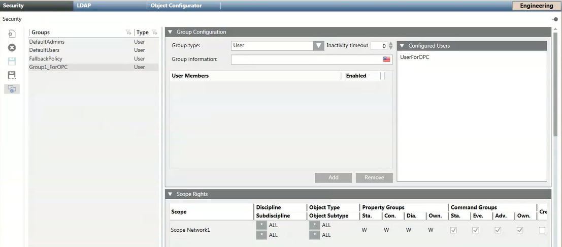 - Finally, you must specify the scope rights of the OPC group (see Link Scopes to the OPC User Group).