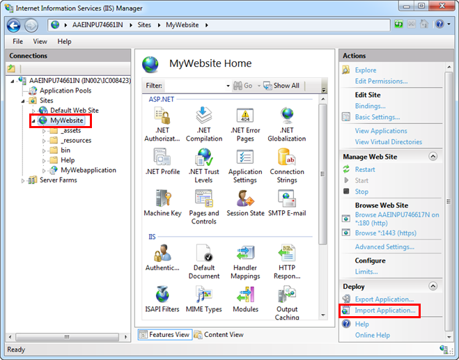 3. Select Sites > [website] and click Import Application from the Actions pane.