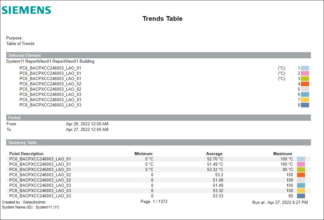 This report is designed to show values of multiple trended objects compared over a range of time. A separate column displays for each trended data point. Additionally, if the data point was in alarm at the time of the reported value, the color of that value displays in red.
