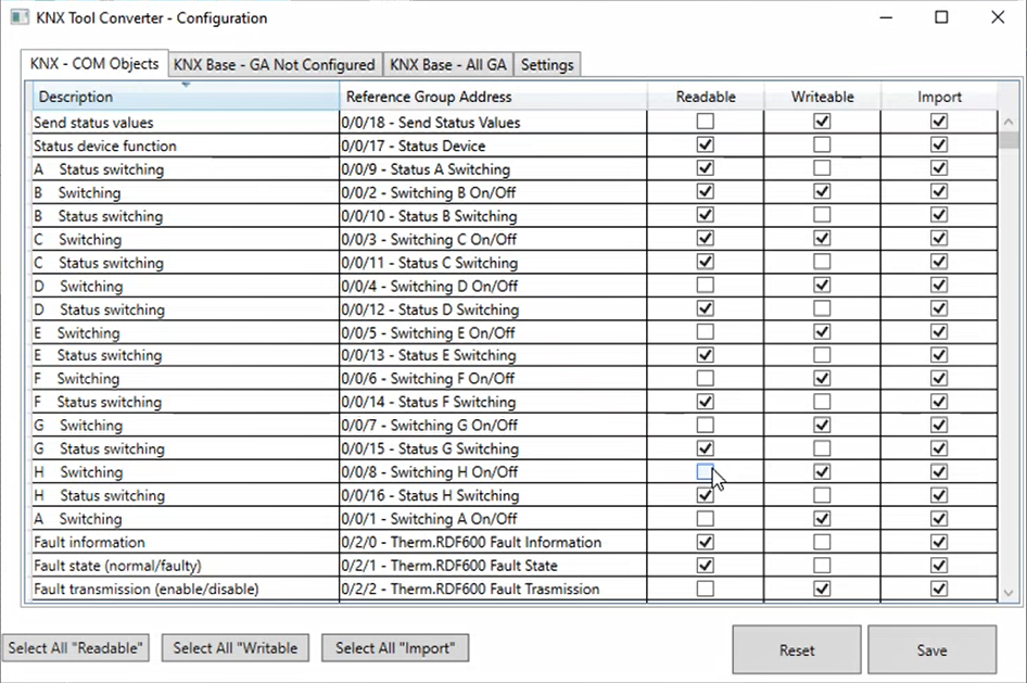 NOTE: To set to readable all the KNX COM objects included in the configuration file, click Select All “Readable”. - In the Writable column, select the check box that corresponds to each writable KNX COM object to be commanded by Desigo CC.