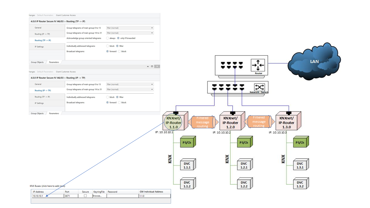 - If filtered message routing is activated on the KNXnet/IP routers, in the KNX adapter, you must configure one KNXnet/IP router only.