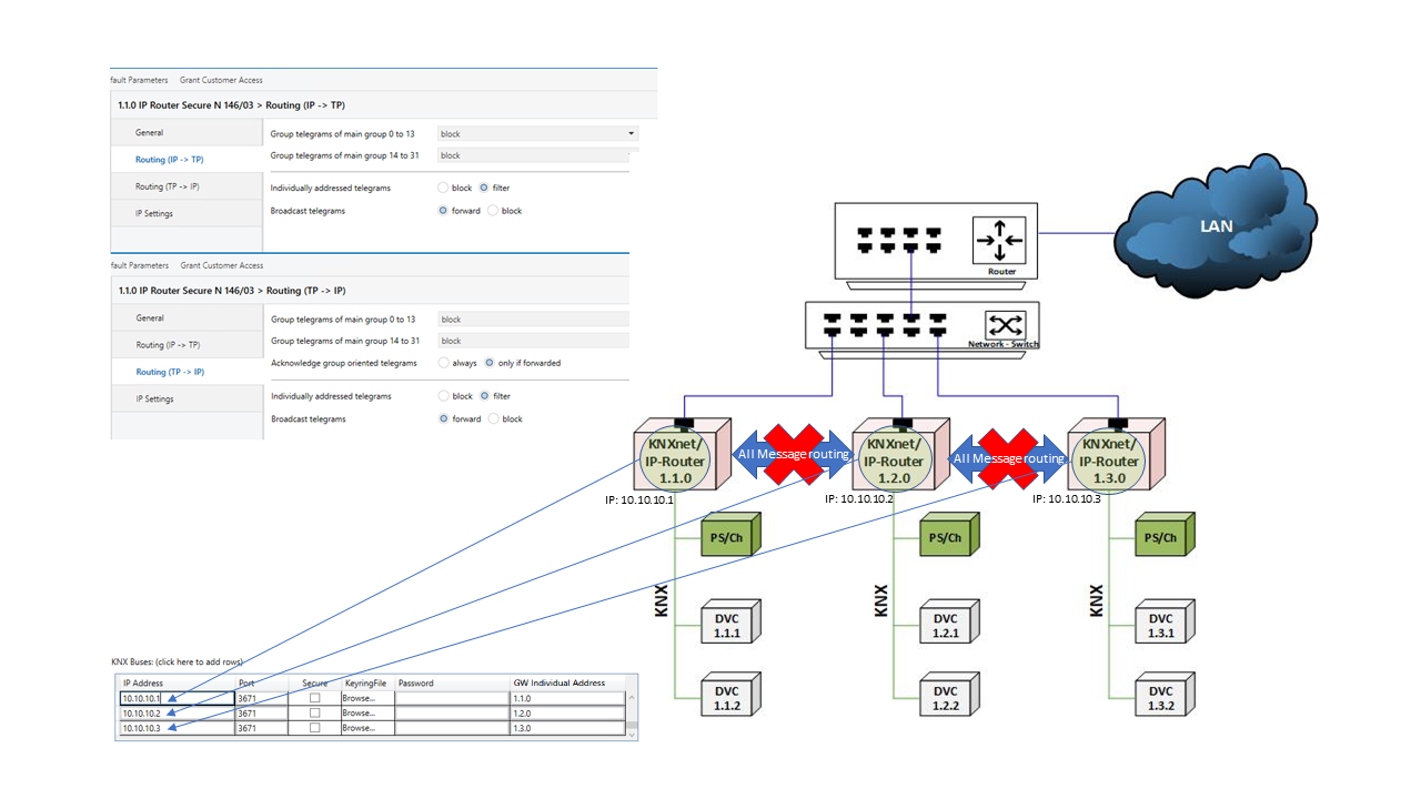 - KNX installation with separate, independent KNX lines that do not use multicast routing between KNX lines.