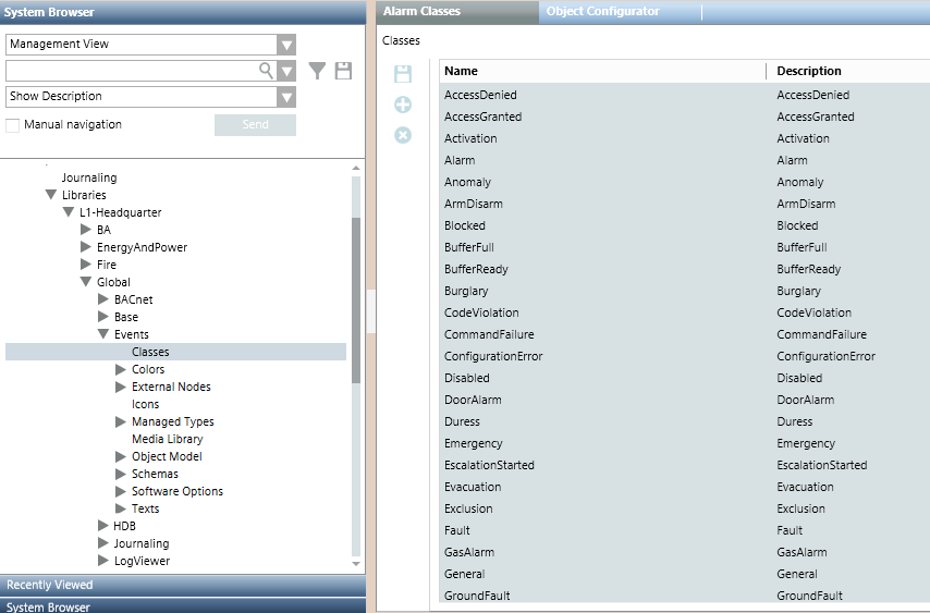 Classes is one of the library blocks of an Events library. Selecting this library block under the Events library of the L1-Headquarter level, the Alarm Classes tab area displays all the alarm types defined by Headquarter that will be used in the event mapping of event schemas. For instructions, see Define the Category and Event Mapping of a Schema.