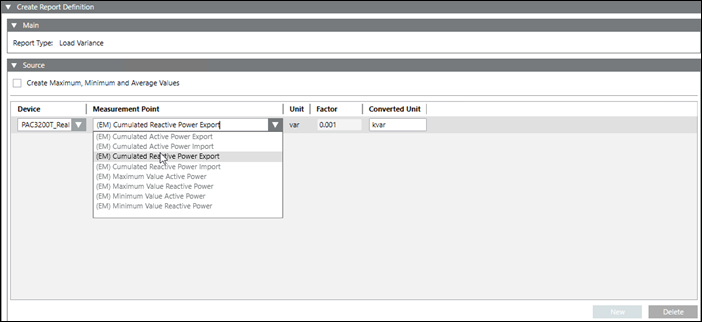 Enter values into the following columns: a. Select the required measurement point for which the report needs to be generated from the drop-down list under the Measurement Point column. b.Unit c.Factor d.Converted Unit