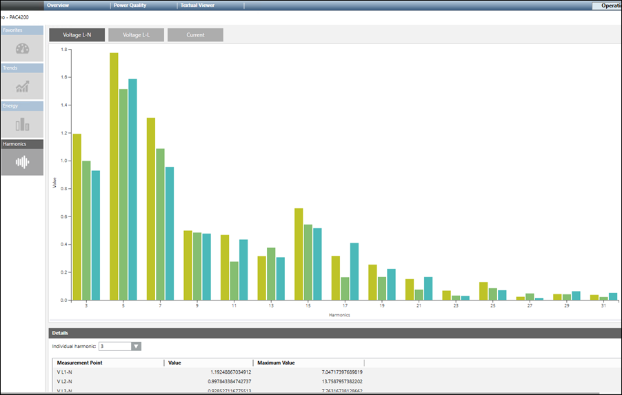 - Voltage L-N: Displays the line-to-neutral voltage harmonics.