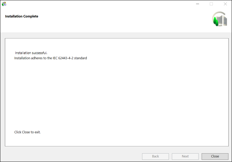 If all the installed extensions are IEC certified, a message "Installation adheres to the IEC 62443-4-2 standard" displays in the Installation Complete dialog box.