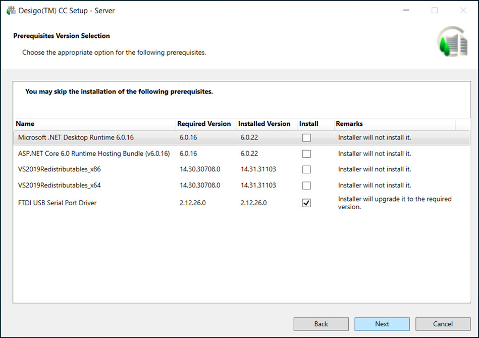 - The Prerequisites Version Selection dialog box displays listing the required versions of the installed prerequisites and the actions the Installer will take during the upgrade.