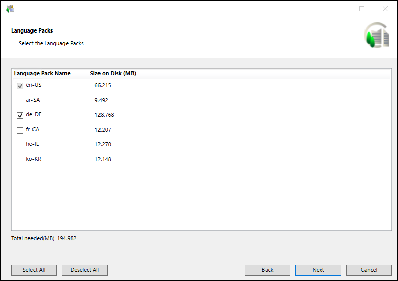 NOTE: Make sure you install only required language packs and extensions, as it adds to the total disk space. All required language packs must be installed before you create a customer project. See Determine the Language Packs and Supported Languages in Obtain and Verify the Software Distribution. - Click Next.