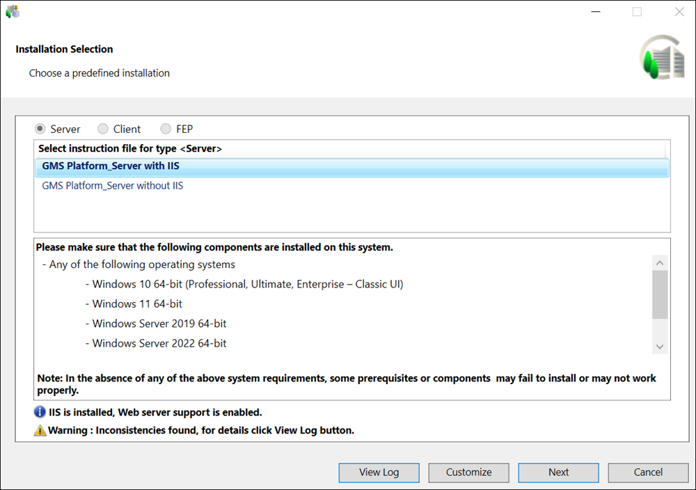 For any consistency issues regarding the distribution media, for example, platform (GMS folder) or EM folder, including the post-installations steps, an error or a warning message display in the Installation Selection dialog box and you can view details by clicking View Log. For more information see, Consistency Check Scenarios. - (Optional and required only when you want to install and configure IIS on the installed setup type) Verify that the checkbox for IIS configuration is selected. The checkbox displays only when no IIS component is installed on your machine. Thus, the configuration of IIS settings are automated only if when they no IIS settings are configured already. However, if any IIS component is already installed, a warning message displays informing you to manually configure IIS. (see manually install and configure IIS on the Server/Client/FEP computer in Additional Installer Procedures).